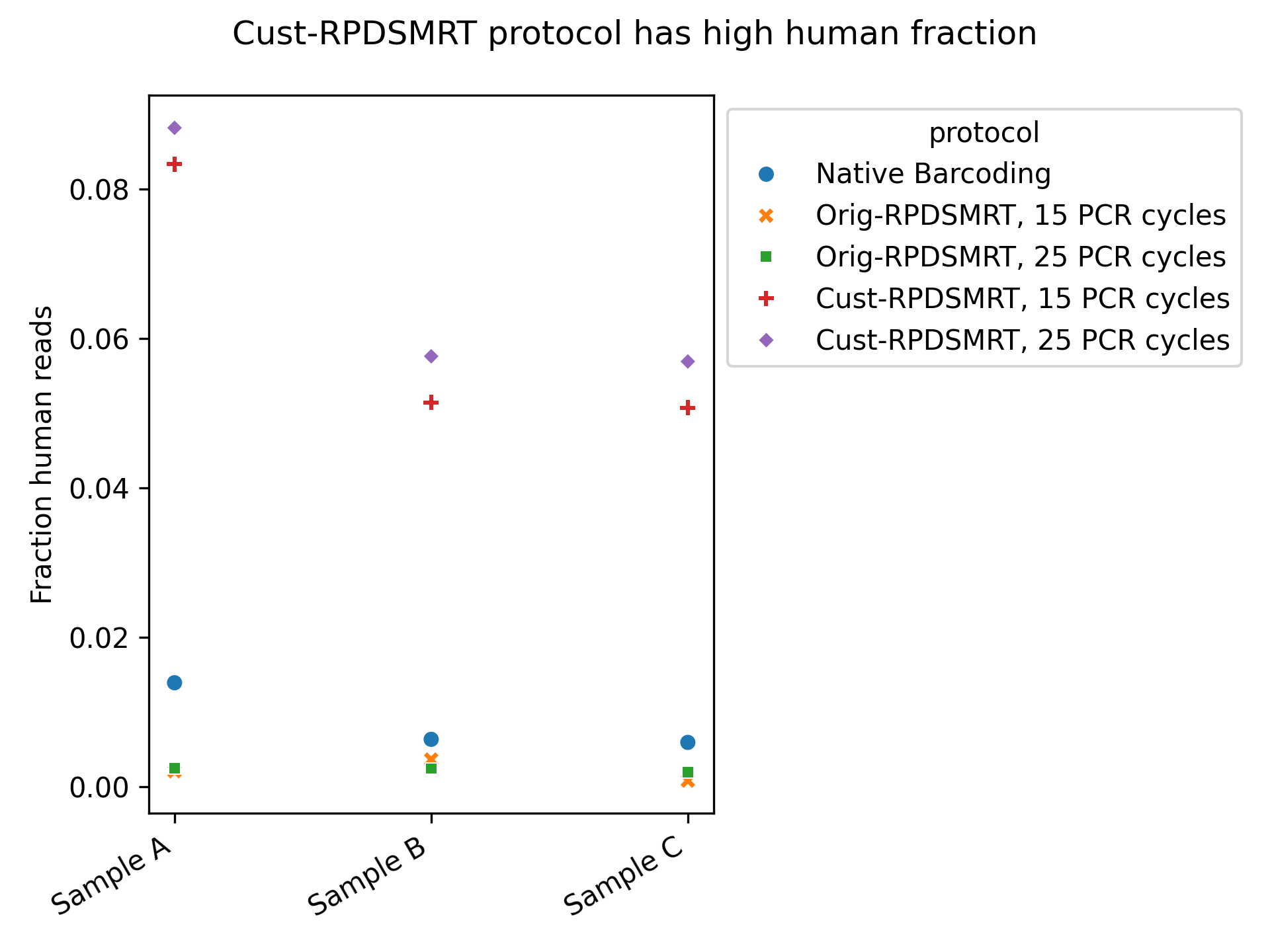 By contrast, Cust-RPDSMRT looks potentially problematic–it has the highest fraction of “reads removed by cleaning” and of eukaryotic reads. To follow up, we looked specifically at the fraction of reads mapping to the human genome (Figure 4); we want this to be as low as possible. As we can see, this is much higher with the Cust-RPDSMRT protocol than with either of the other protocols.